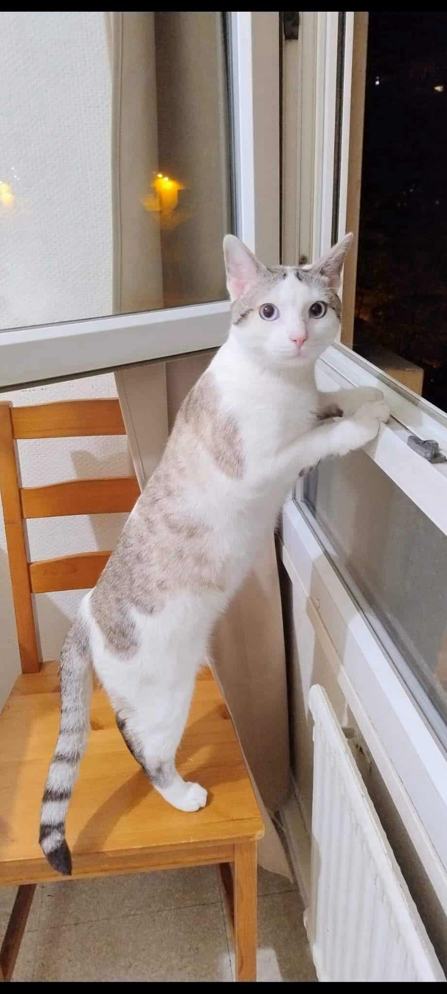 Zébulon est blanc et gris, avec de beaux yeux bleus, il serait europeen croisé siamois . Il est identifié et stérillisé.
